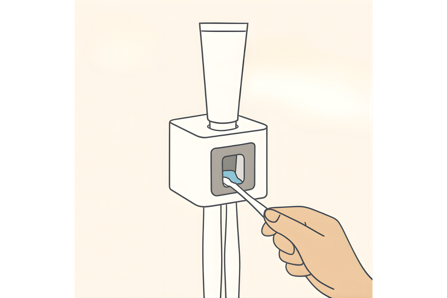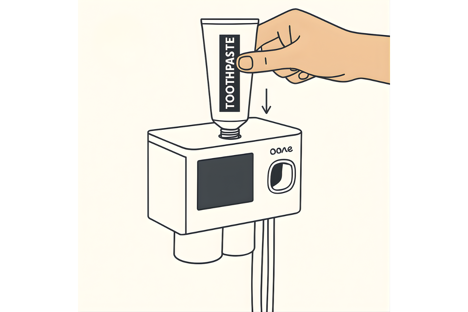 El sistema 2 en 1 combina soporte y dispensador para uso familiar. Ofrece espacio para hasta 6 cepillos de dientes y funciona con todo tipo de tubos estándar. Para el primer uso, presiona manualmente la pasta para activar el mecanismo de salida.