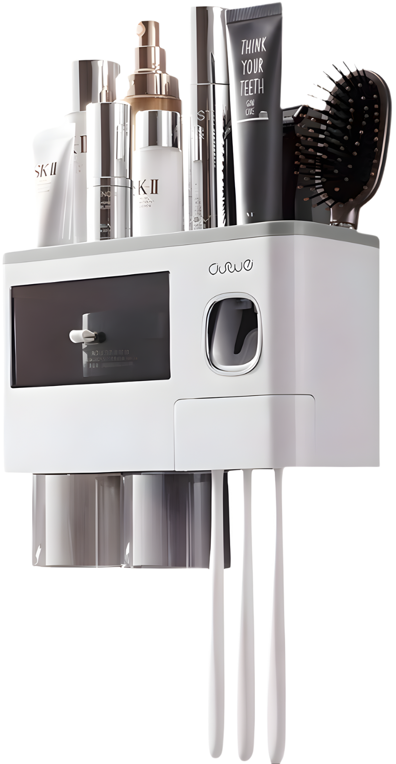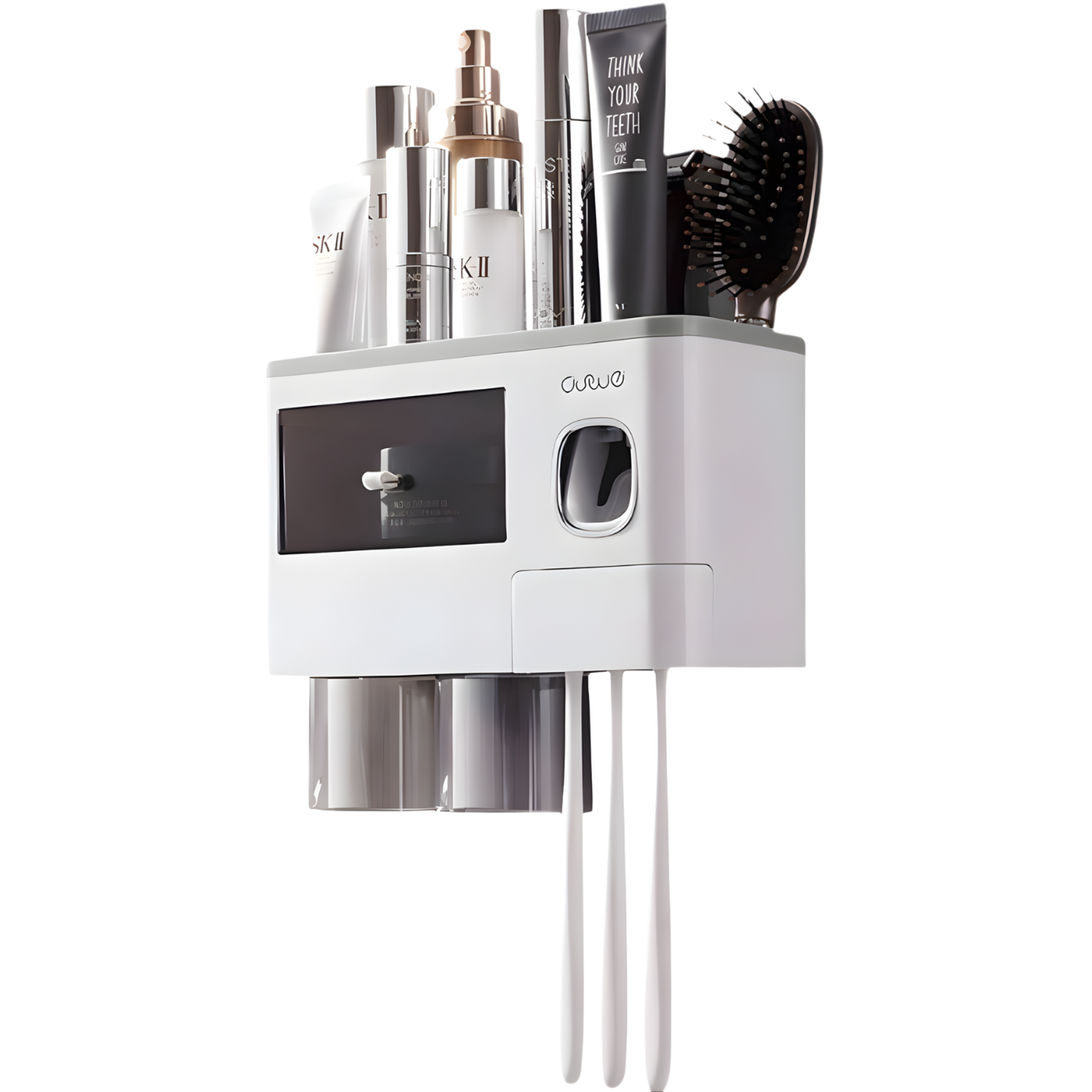 Este dispensador automático de pasta de dientes está diseñado para optimizar el espacio y mantener el baño ordenado. Incluye soporte para cepillos, 2 vasos magnéticos y un práctico cajón organizador. Su instalación en pared permite un uso cómodo y libre de desorden.
